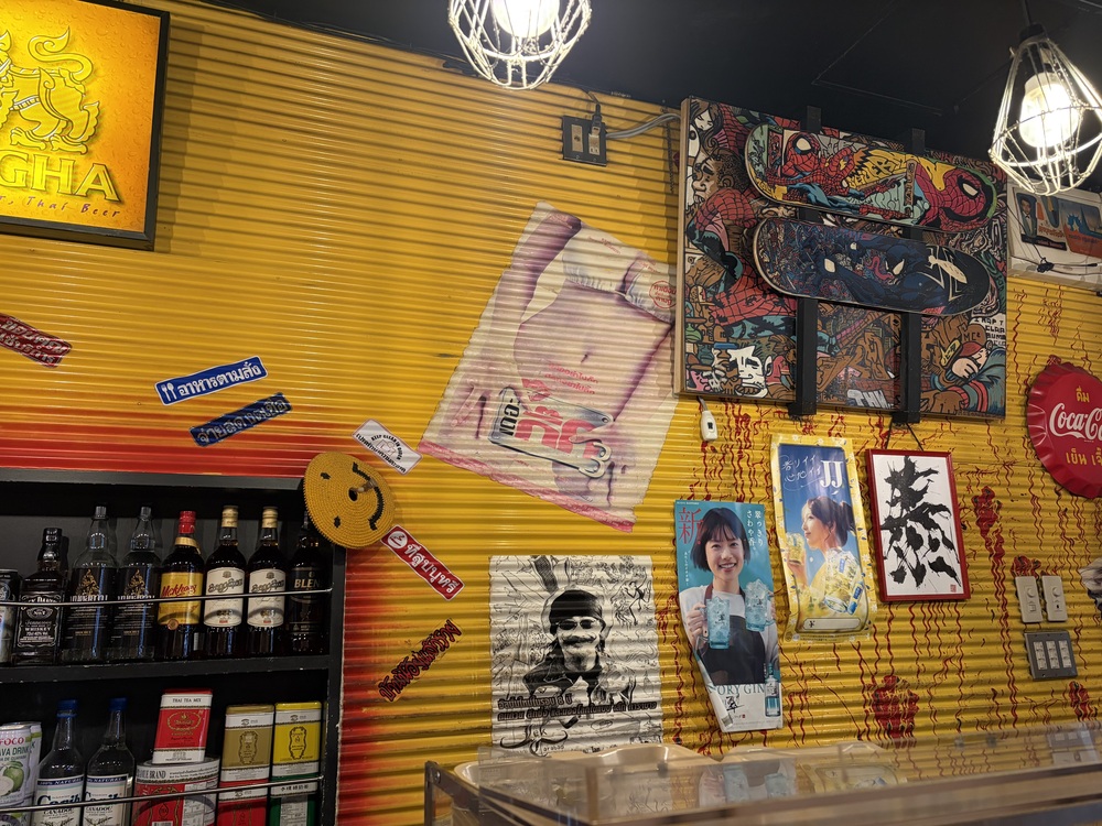 店内は、まるで外国を旅しているかのような内装で、壁にはたくさんのポスターが飾られています。カウンターや棚にはさまざまなお酒が並び、目でも楽しめる空間です。