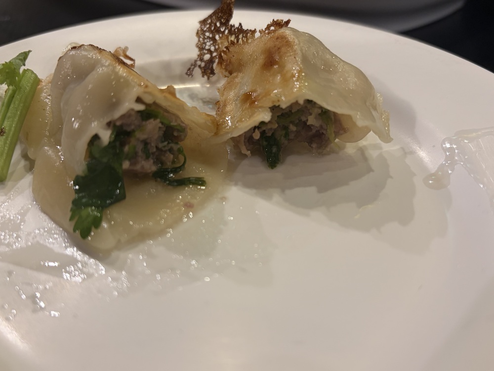 中にはひき肉や玉ねぎ、にんじん、ニラが入っており、鶏ガラの風味とよく合います。