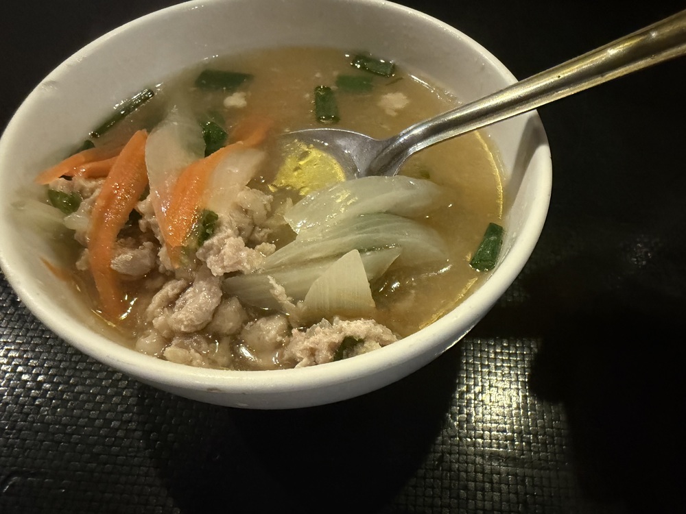 今回はシンプルな鶏ガラスープで、ひき肉と鶏ガラの出汁が、お酒を飲んだ後の身体に染み渡ります。