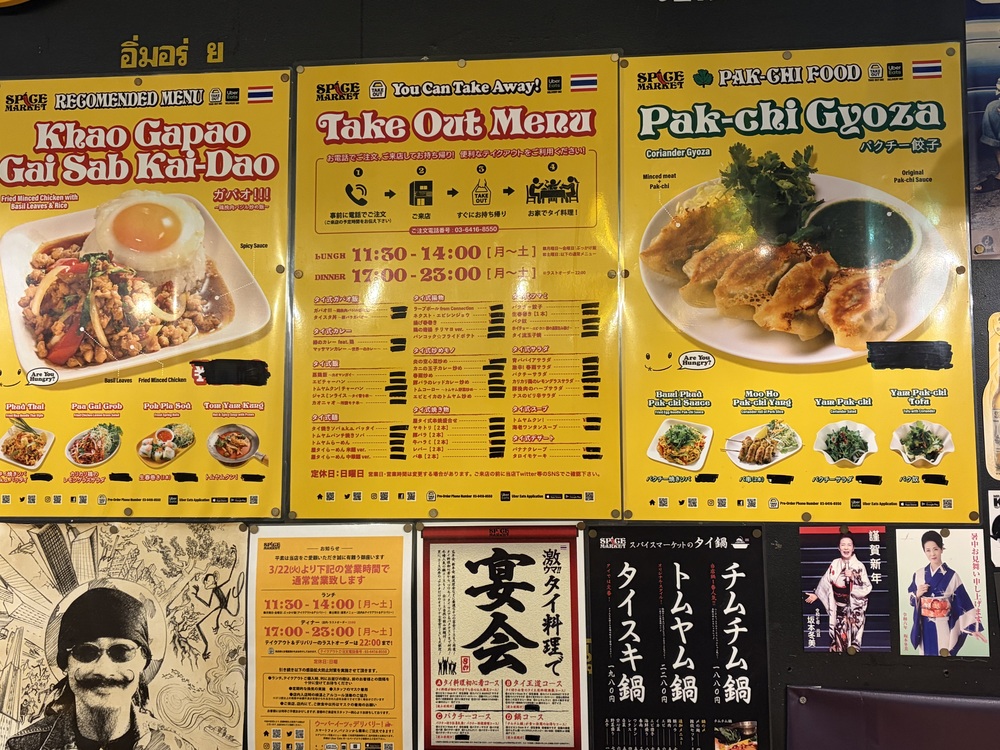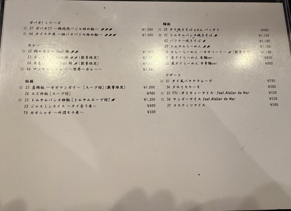 こちらのメニュー表には、ガパオライスやタイカレー、麺類など、しっかり食べたい人向けの品揃えが並んでいます。