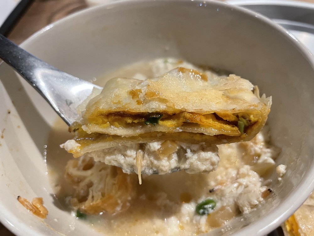 サクサク、カリカリな食感で、噛むと揚げ油がジュワ〜と口の中に広がり、香ばしい香りに包まれます。スープを吸ったこのジューシーな揚げパンがたまりません!