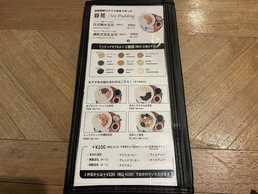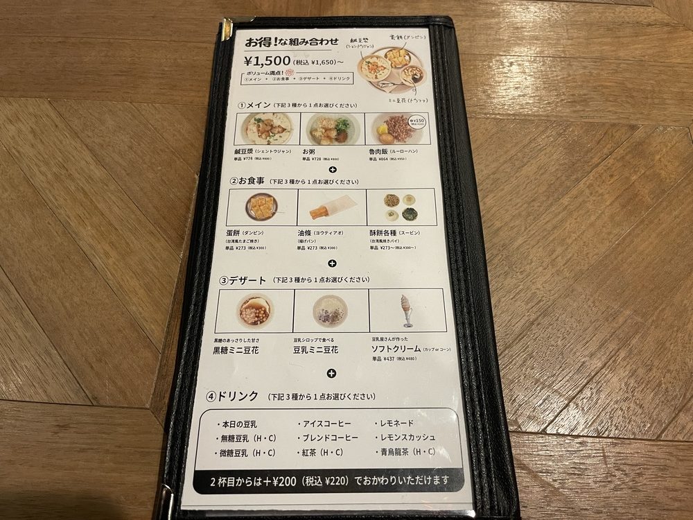 メイン+食事+デザート+ドリンクが1,500円で楽しめるお得なセットや、さまざまなトッピングが選べる豆花、こだわりの豆乳をはじめとするドリンク類も豊富です。