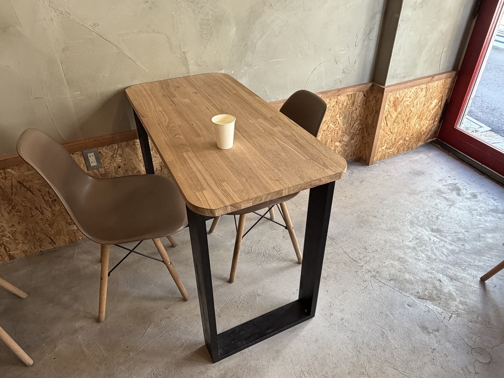 大きな窓を構えた店内は、外の日差しを感じることができ、温かみがあります。淡いグレーのモルタルで仕上げられた壁と、統一されたテーブルやイスの組み合わせがスタイリッシュ。