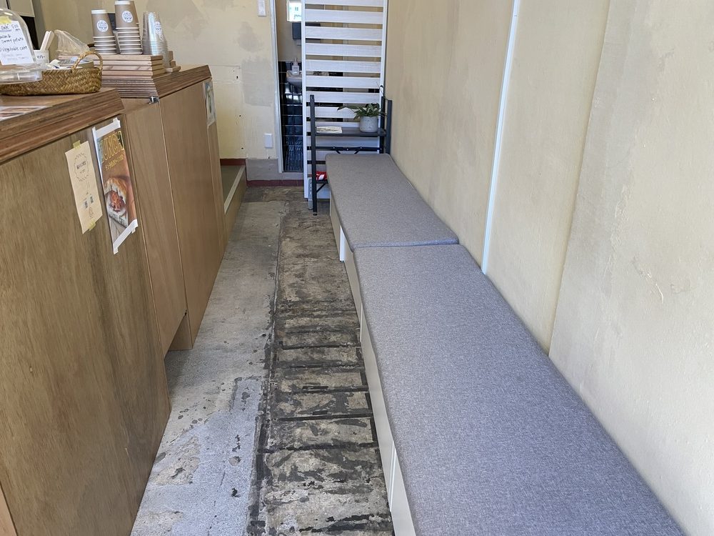 店内に入ると、お菓子が並んだカウンター、カウンターに向かうような形のベンチ、店内奥のテーブル席がありました。