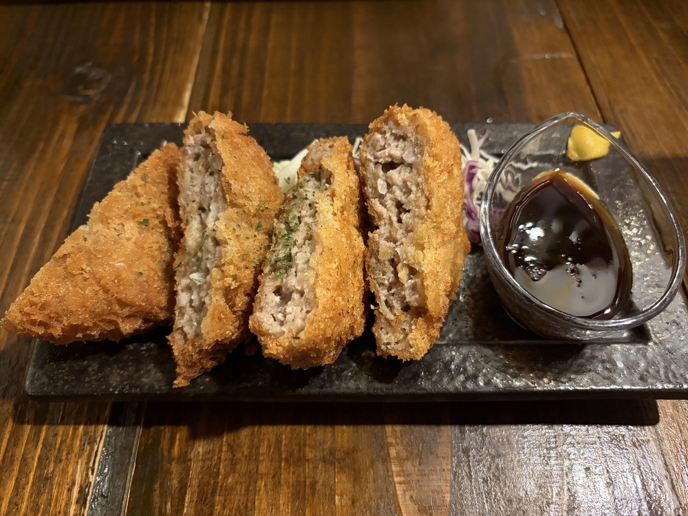 肉の旨みが口いっぱいに広がり、期待を裏切らないおいしさです。また、ソースとサクサクとした衣がよく合います。