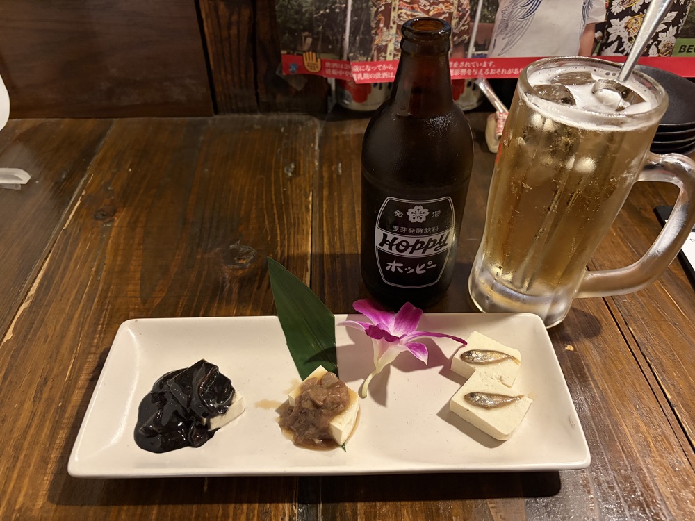 席についてさっそく、泡盛と沖縄珍味の三点盛りを注文しました。