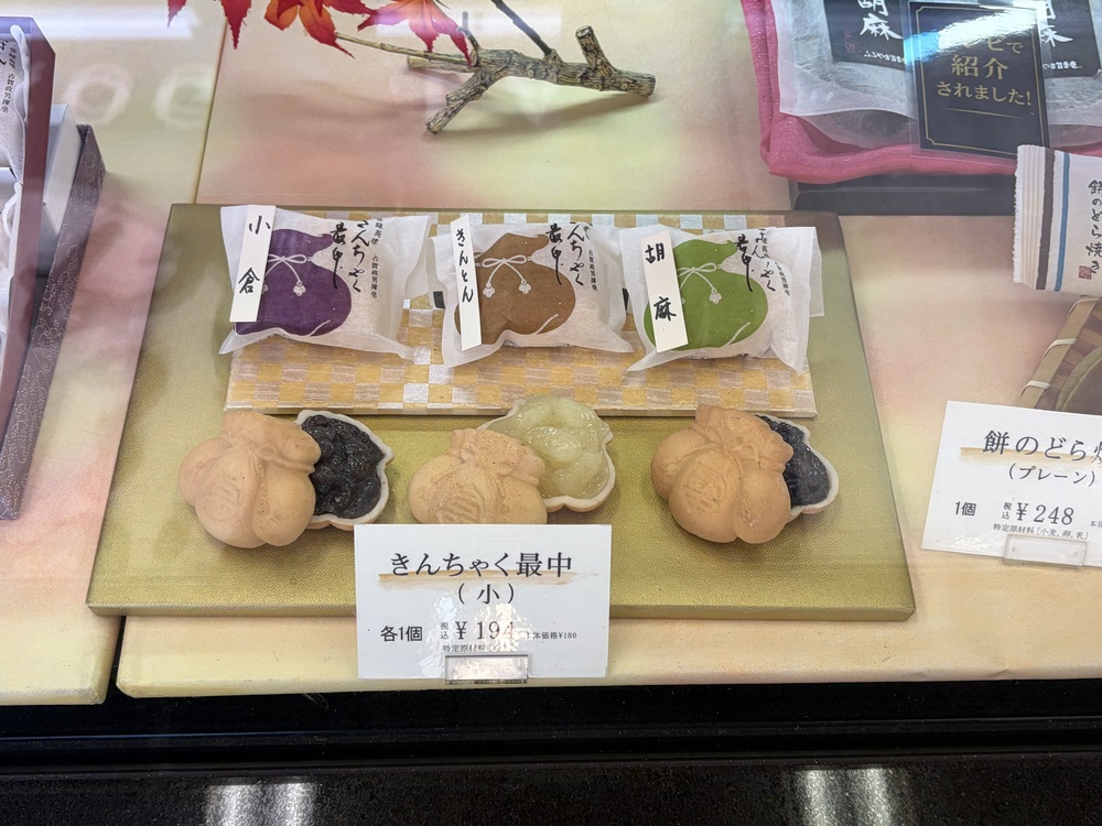 きんちゃく最中は、小倉・きんとん・胡麻の3種類があり、いずれも温かいお茶と相性の良い一品です。見た目も上品で、1個194円と手に取りやすい価格なのも魅力です!