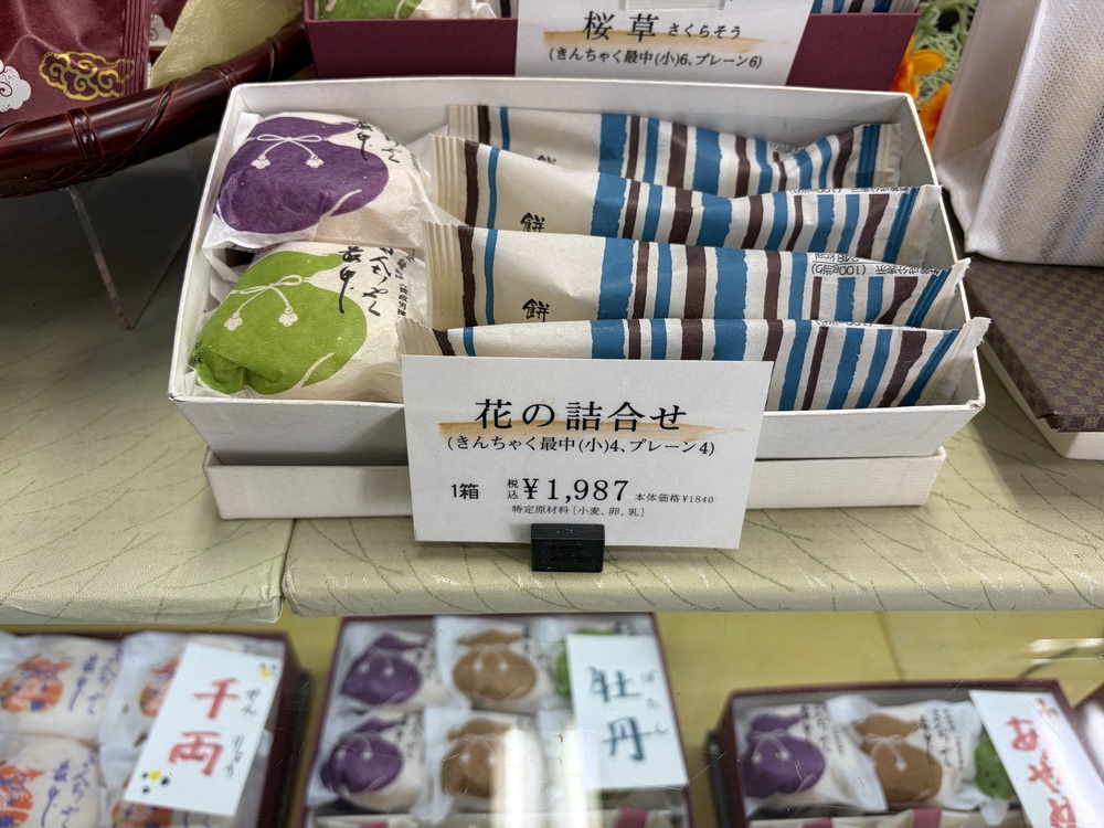 今回は、みたらしだんごを2本と、花の詰め合わせ(きんちゃく最中〈小〉と餅どら焼き4個のセット)を購入しました。
