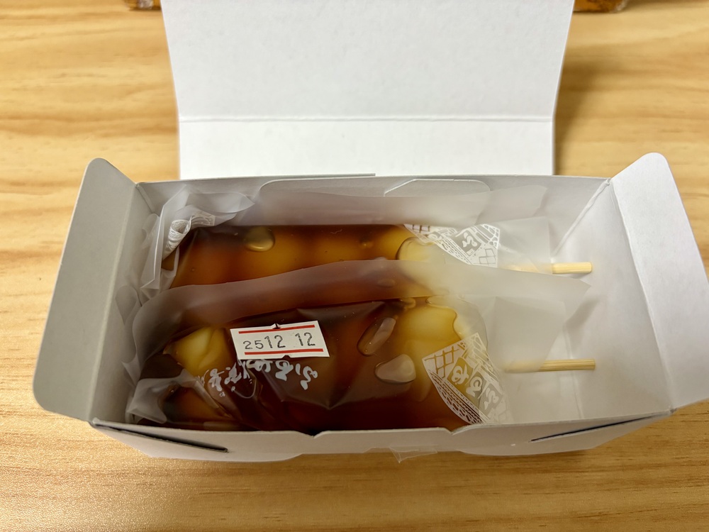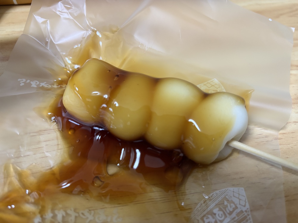 みたらしだんごを包みから出してみると、弾力のあるだんごと甘しょっぱい醤油の香りが食欲をそそります。だんごにはみたらしがたっぷりかけてあり、心遣いを感じました。