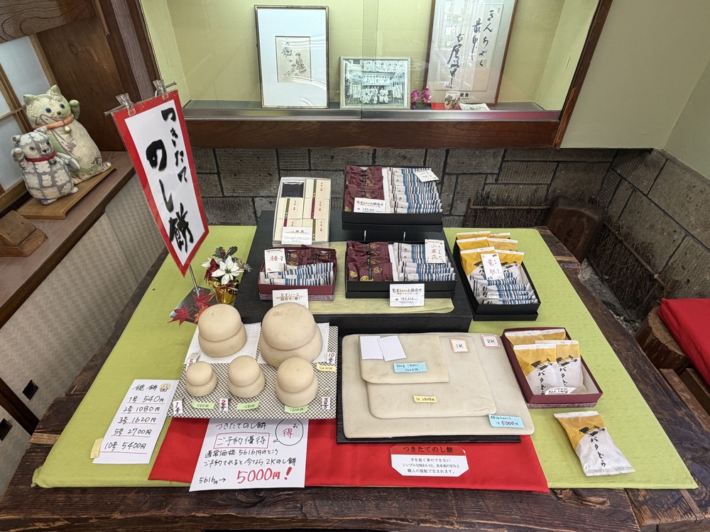 私がお伺いしたのは12月12日(金)で、年末を前に、つきたてののし餅の予約受付が行われていました。店頭に並ぶのし餅を目にすると「2025年も残り僅かだな〜」と実感させられます。